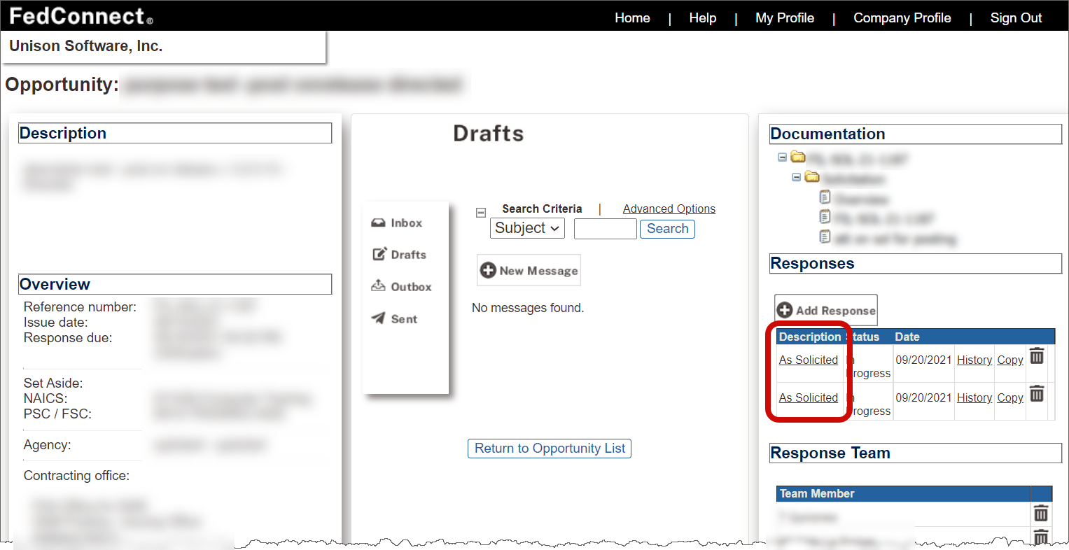 If you are a member of your company's response team for an opportunity, you can open and view responses that are in progress or that have already been submitted. If the response has a status of In Progress, you can edit and submit the response; however, if the response has a status other than In Progress, you can only view the response.